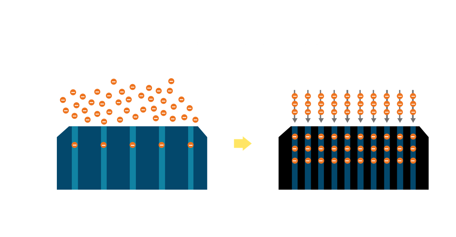 • 电池使用多条铜导线 (Copper wire) 于电池片上形成较短的电流路径,提高电流收集效率,采用圆形设计的铜导线较传统扁平式的铜焊带 (Ribbon),可增加入射至电池的光线量。